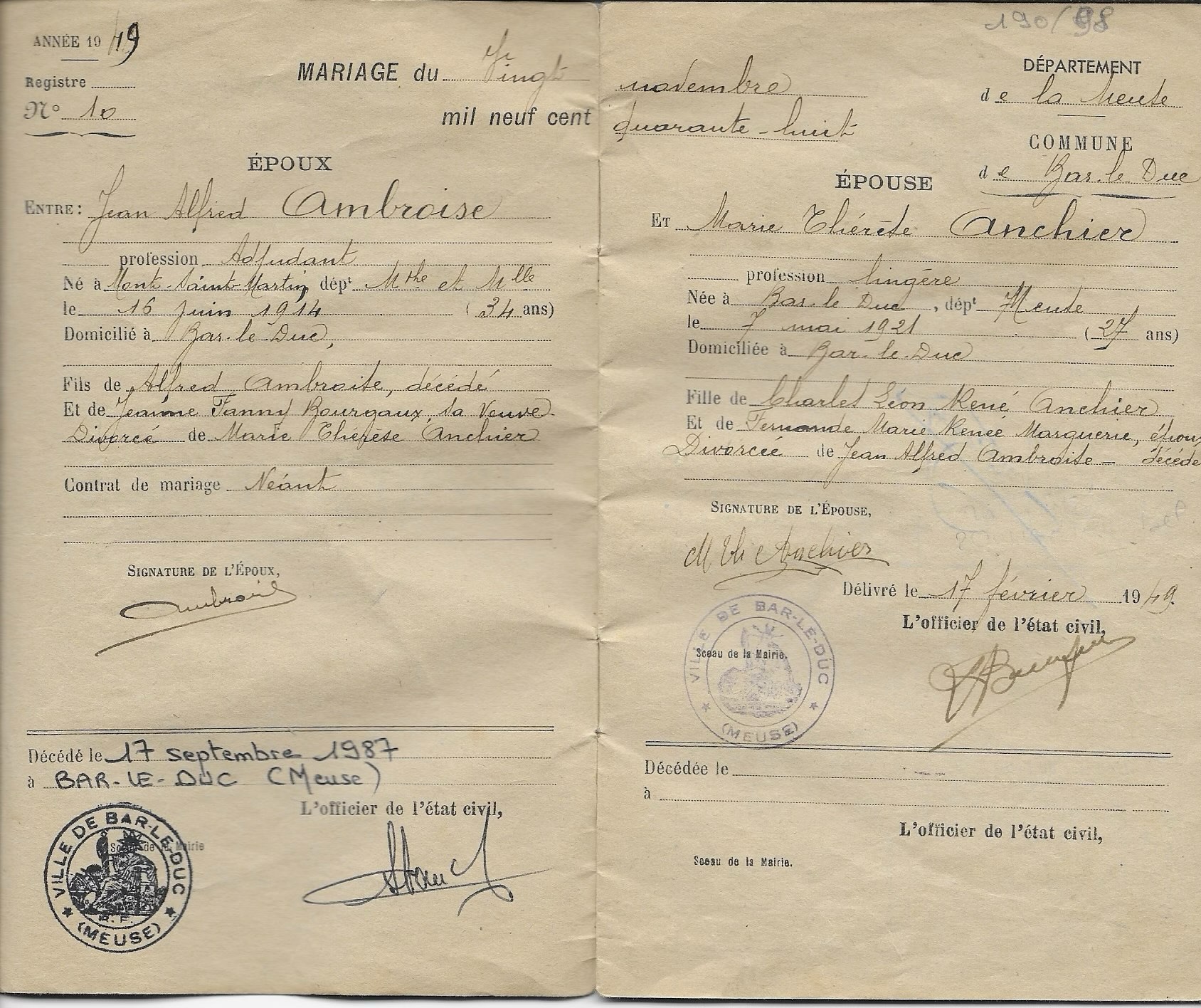 Marie-Thérèse Anchier et Jean Ambroise se seraient rencontrés lors d’un bal, d’après un souvenir que j’ai du récit de ma grand mère. Très vite, ils se marient le 30 avril 1938 (Marie-Thérèse a encore 16 ans!). De cette rencontre naît un premier enfant, en juin 1939, en pleine entrée dans la tourmente de la Seconde Guerre mondiale.